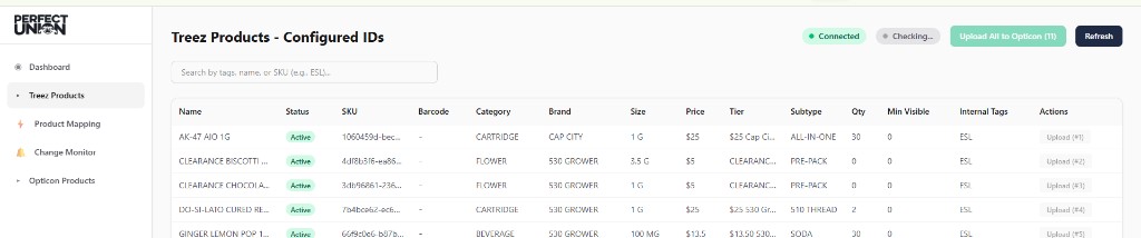 â Success Criteria: All products visible in Opticon with correct data. ProductId should be sequential (1, 2, 3...) and Barcode should contain Treez UUIDs.